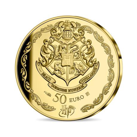 - La monnaie de 50€ – Harry et Dumbledore – en or fin (99,9%) mesure 22mm. Tirée à 1000 exemplaires, elle pèse 7,78gr et coûte 660€ à l’achat.