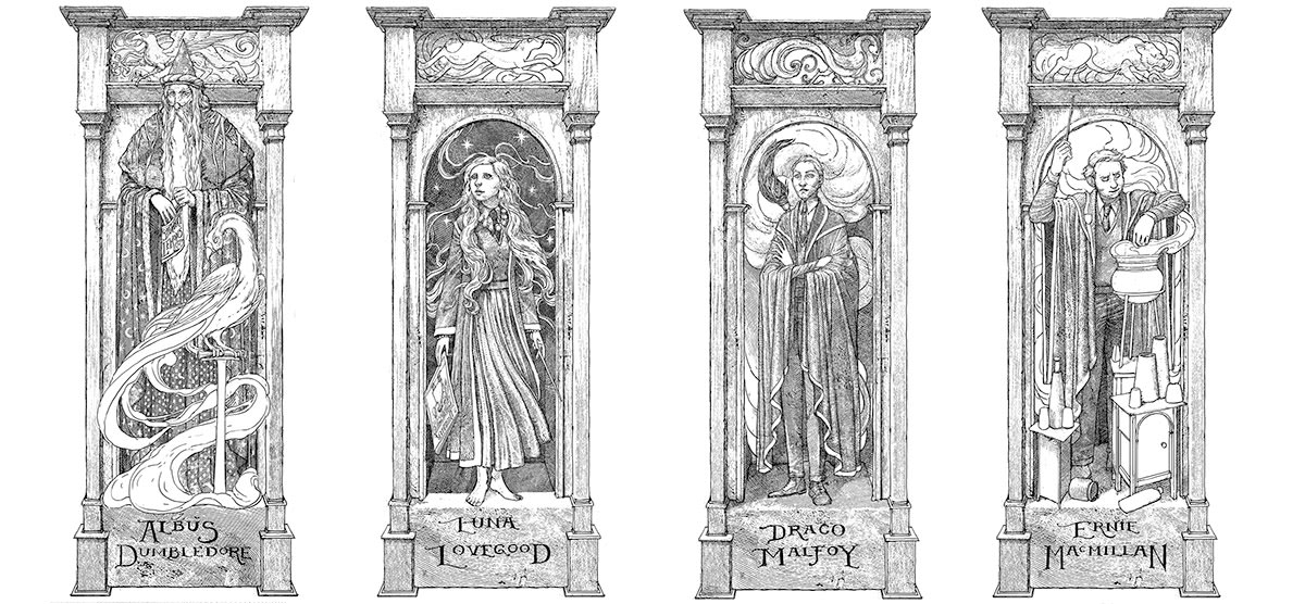 Pour les Poufsouffle, Norbert fait bien sûr figure d’icône, mais Levi Pinfold met également Ernie Macmillan, un préfet exemplaire, à l’honnneur. En ce qui concerne les Serdaigle, le plus grand charmeur de tous les temps, Lockhart, est bien évidement accompagné de Luna. Au vu de son importance dans ce tome, il n’est pas étonnant de voir Drago accompagner Rogue dans l’édition Serpentard. Le duo le plus emblématique de roman est bien sûr illustré dans l’édition jaune et or où Harry et Dumbledore ont le droit chacun à leur dessin.