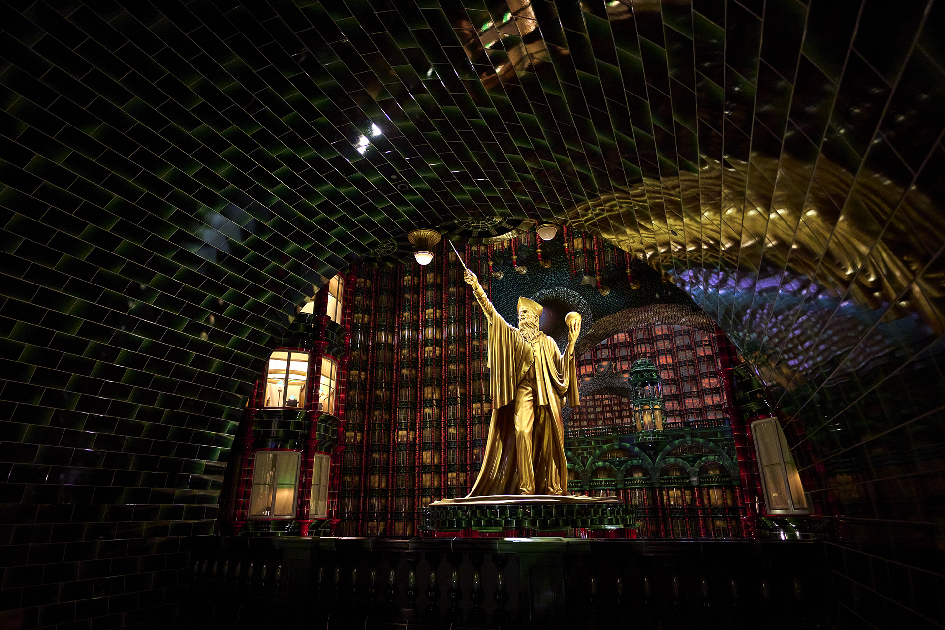 L’équipe du film a scindé la Fontaine de la fraternité magique en deux ! Le Sorcier est sur un piédestal à part ! Il s’agit de ce mage gigantesque, qui surplombe l’atrium depuis un autre hall du ministère, et qu’on aperçoit sur certains plans du films. Il est bien là, brandissant sa baguette vers le ciel, exactement comme l’indique le livre.