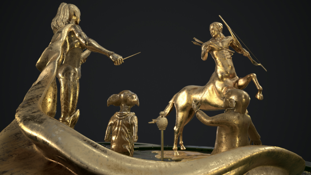 Mais avant de plonger dans la version des films, il faut revenir à celle des livres. La première description de la fontaine présente cinq statues d’or, plus grandes que nature, au centre d’un bassin circulaire. La plus haute représente un sorcier qui pointe sa baguette vers le ciel. À ses côtés, on trouve « une sorcière d’une grande beauté » qui brandit elle aussi une baguette. Autours, un gobelin, un elfe de maison et un centaure contemplent les deux humains avec adoration, tandis que de l’eau jaillit, respectivement, de leurs baguettes, de leur chapeau pointu, de leurs oreilles et de la pointe de leur flèche.