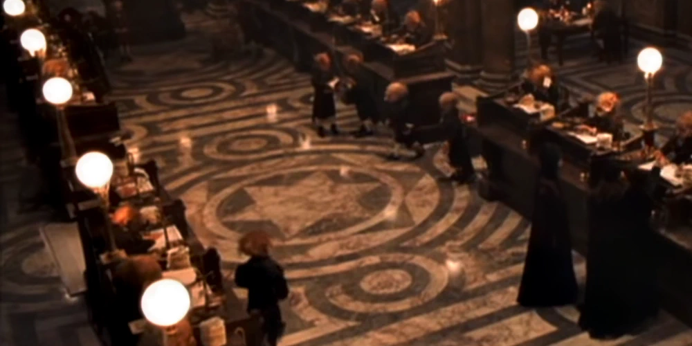 Dans ce cas précis, il faut noter que le sol est celui de la Australia House, à Londres, qui a servi de décor au premier film. Quand la banque a été reproduite en studio pour Les Reliques de la Mort, puis sur le Chemin de Traverse dans le parc Universal Studios d’Orlando, et enfin au Studio Tour de Londres, l’étoile à six branche a disparu.
